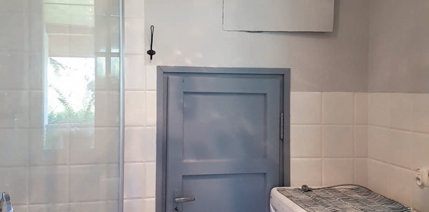 Odległość od narożnika do drzwi do kotłowni pozwoliła na umieszczenie tam prysznica. Zdecydowano się na kabinę pięciokątną, która wprawdzie nie zapewnia takiego komfortu jak półokrągła, jednak ścięty narożnik sprawia, że zajmuje ona w łazience naprawdę mało miejsca. Otwierane drzwiczki mają niewielki wysięg – w tym przypadku nie ma konfliktu ani z drzwiami do kotłowni, ani z żadnym ze sprzętów. Komfort korzystania starszym osobom zapewni niski brodzik.