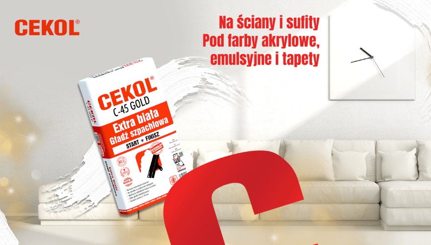 Extra biała szpachla gipsowa CEKOL C-45 GOLD miała stać się produktem łatwym i przyjemnym w całym procesie szpachlowania: od nałożenia, poprzez obróbkę, aż do finalnego efektu. Dlatego też wprowadzono do niej szereg udoskonaleń, między innym produkt zyskał możliwość nakładania „mokro na mokro”, co znacząco skraca czas pracy, a sama gładź daje się szlifować metodą „na mokro”, niwelując ilość kurzu podczas prac wykończeniowych. Tym samym gładź na mokro to idealny wybór zarówno na start do przygotowania podłoża, jak i na finisz, na ostateczne wygładzenie pod wszelkie rodzaje farb i tapet. Ponadto dzięki miesiącom badań oraz prób udało nam się uzyskać certyfikat EC1+, świadczący o tym, że masa szpachlowa CEKOL C-45 GOLD to produkt nie tylko innowacyjny, ale i ekologiczny. Cekol C-45 posiada szczególnie niską emisyjność szkodliwych dla zdrowia substancji, podczas każdego etapu prac z gładzią.